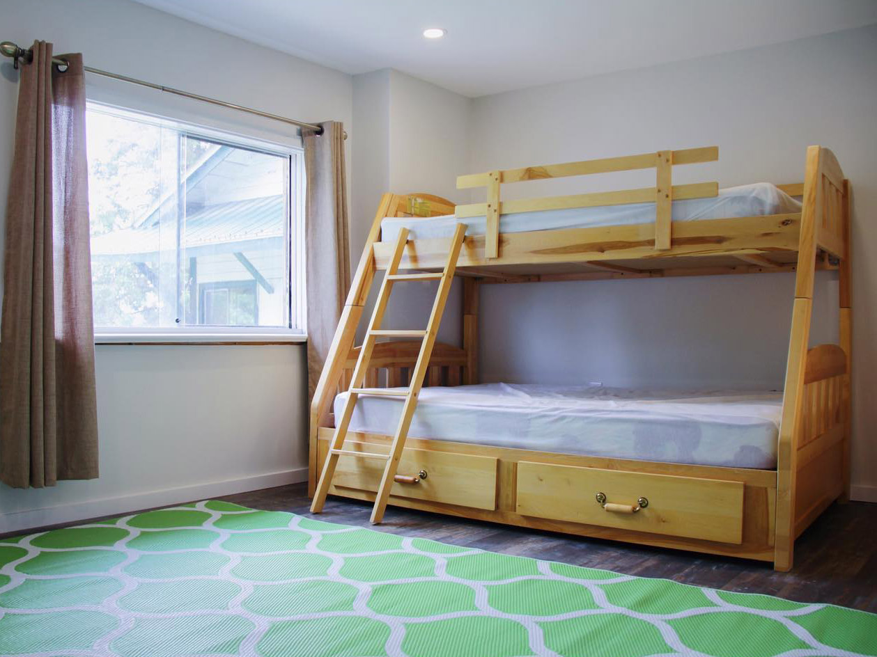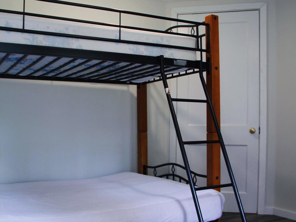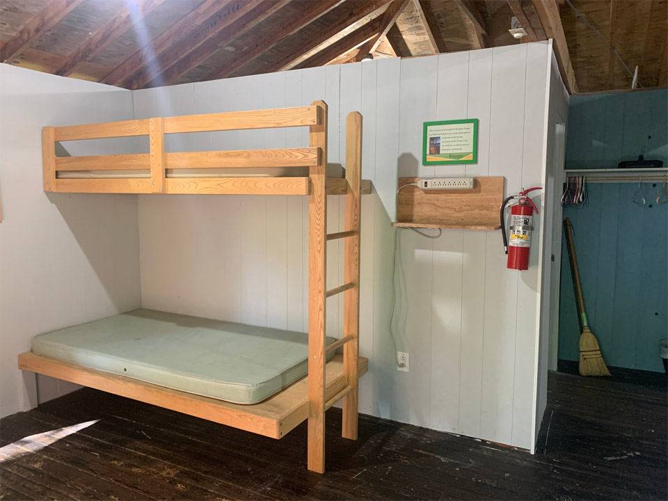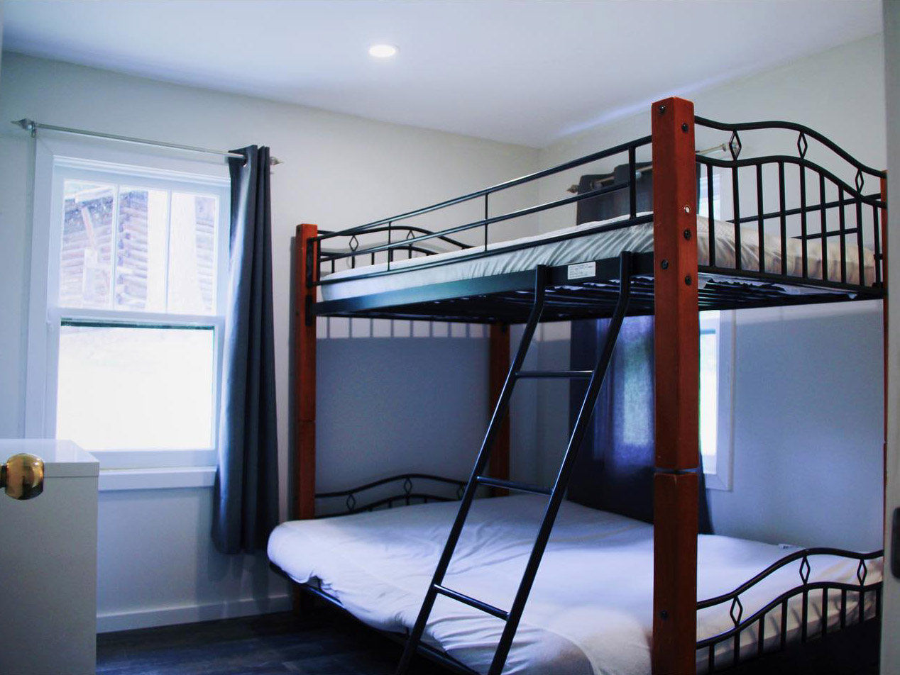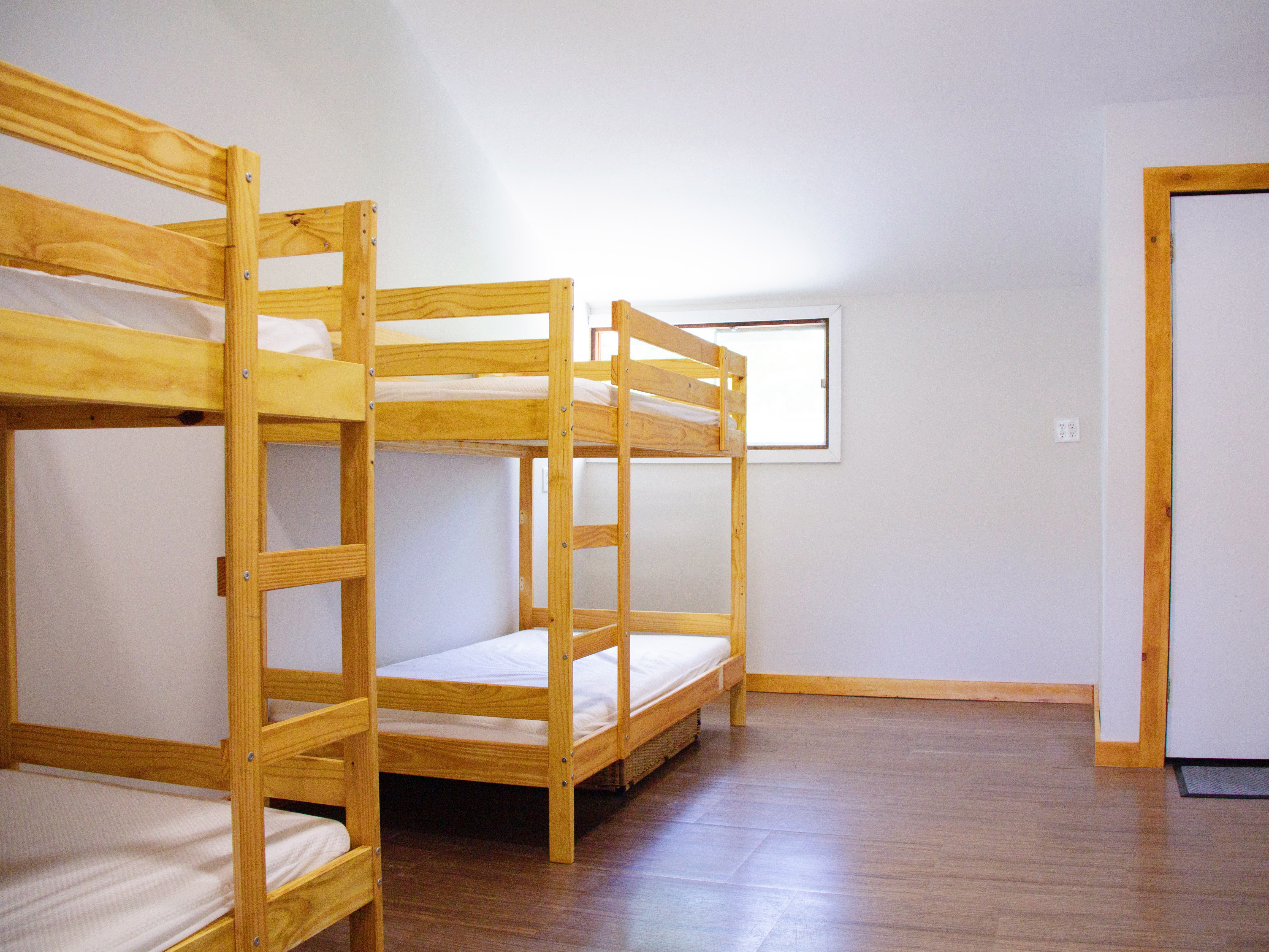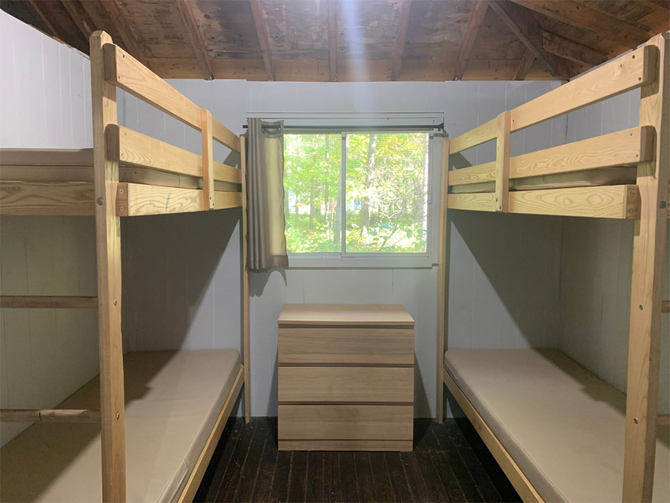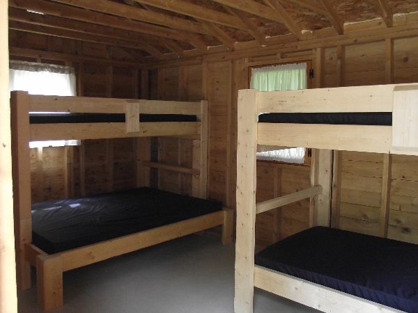 These cabins are used for kids’ camps in the summer and can sleep up to 14 people. There are 3 bedrooms which have 2 bunk beds each (4 single beds), and the main room has one bunk bed (2 single beds). There is a community bathroom located in the center of the cabin area, as well as a communal fire pit. Please note there are no kitchens in the cabin.