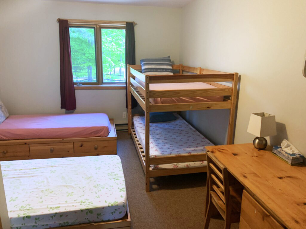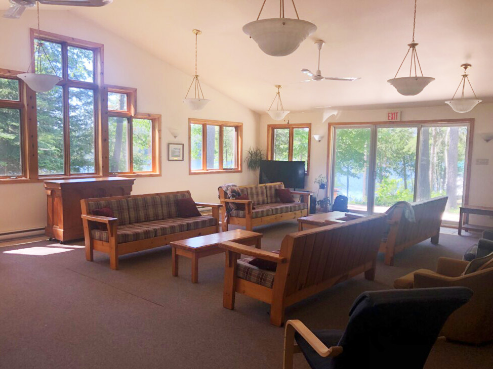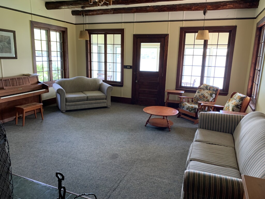 White Pine Lodge is our main year-round facility. It contains 9 bedrooms, our dining hall, staff offices, infirmary, and lounge. The rooms have the capacity to host a group of 33 people, 6 of the 9 rooms contain 2 single beds plus 1 bunk bed (4 total), 2 rooms contain a single over double bunk bed (3 total), and the last room contains a queen bed and single bed (3 total). Our dining hall has a standing room capacity of 120 people with enough space to seat 90 comfortably. Pineview lounge/meeting room has 4 couches, a fireplace, a walkout patio, a library, board games, a TV, and a piano. No pets are allowed indoors