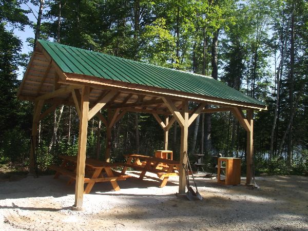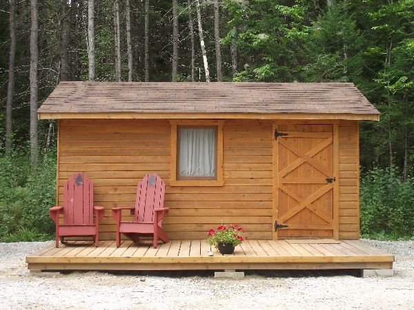 Five cabins complete with bunk beds, a deck, and Adirondack chairs. A covered dining shelter, two outdoor cooking stoves, and a firepit are shared between the cabins.
