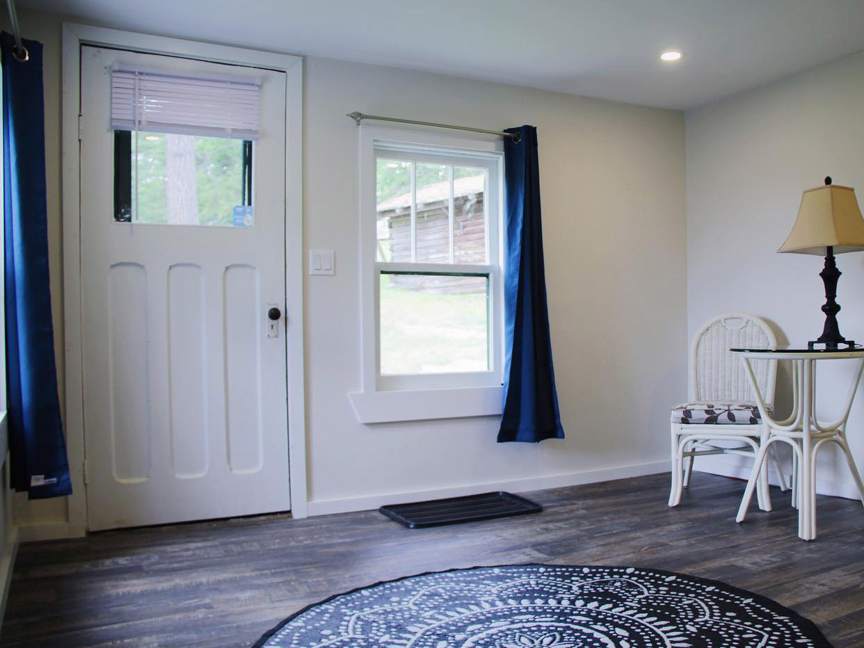 JR unit B is a newly-renovated (2022) suite similar to unit A but suited for more people. The unit can sleep 11 people (Rooms 1, 3 & 4: single-over-double bunk bed, Room 2: queen bed and 2pc washroom). It features a large common arena with a natural wood fireplace, as well as a clear windowed panorama view of the lake. It contains a fully equipped Self-catering kitchen as well as Two 3pc wheelchair-accessible washrooms (public), one 3pc in the dormitory area. Bedrooms 1, 2, & 4 each have an exterior door to access the outdoors from within the room.